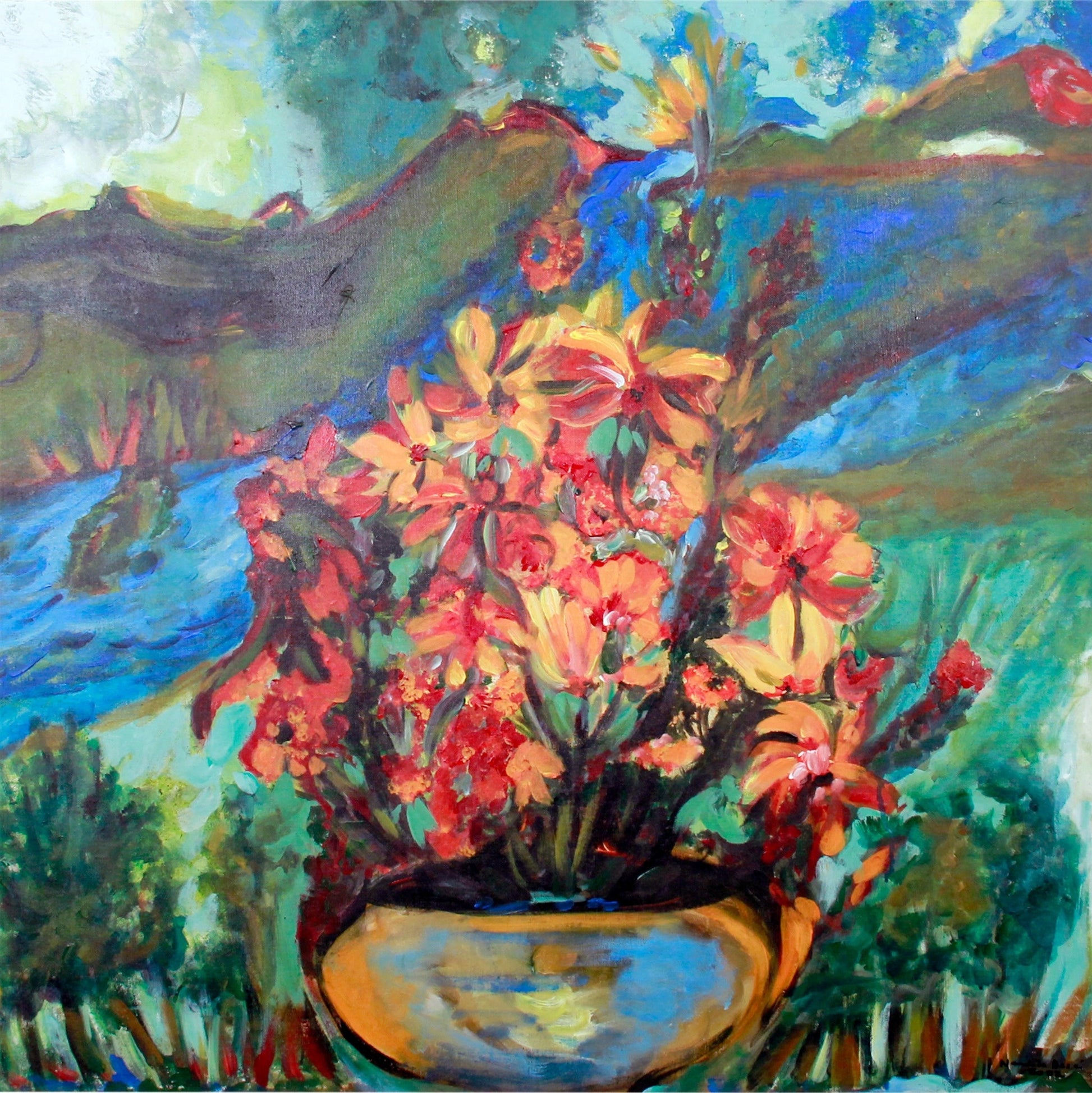 A serene yet textured celebration of riverside foliage. This large-format work balances vibrant flora with an undercurrent of calm movement and reflection.