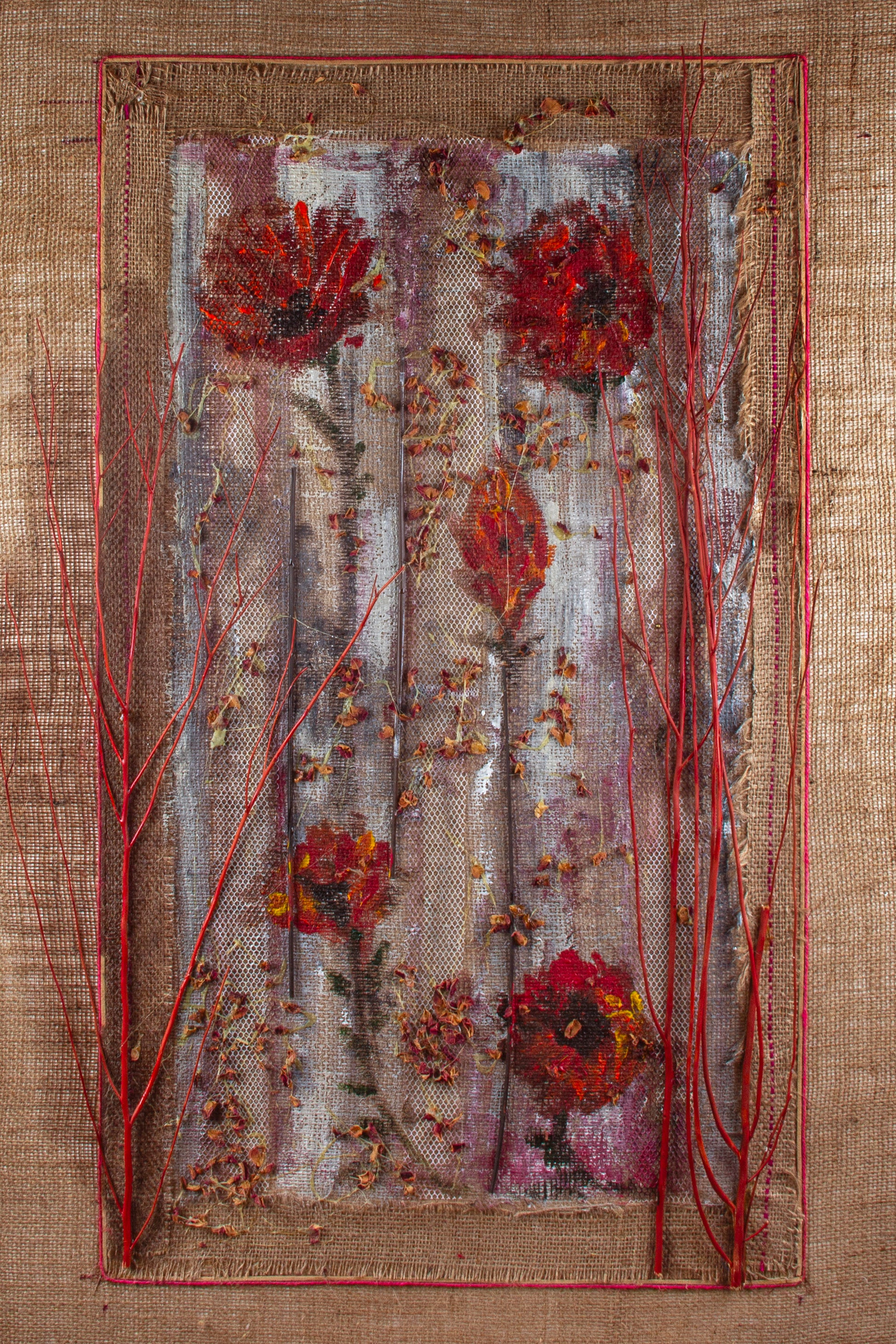 Crafted with jute on canvas, this artwork layers crochet, hand embroidery, appliqué along with painted flowers, and organic dried florals, creating a deeply tactile experience. Each element is thoughtfully placed, echoing the natural world peeking through a timeworn window — fleeting, delicate, and deeply rooted.