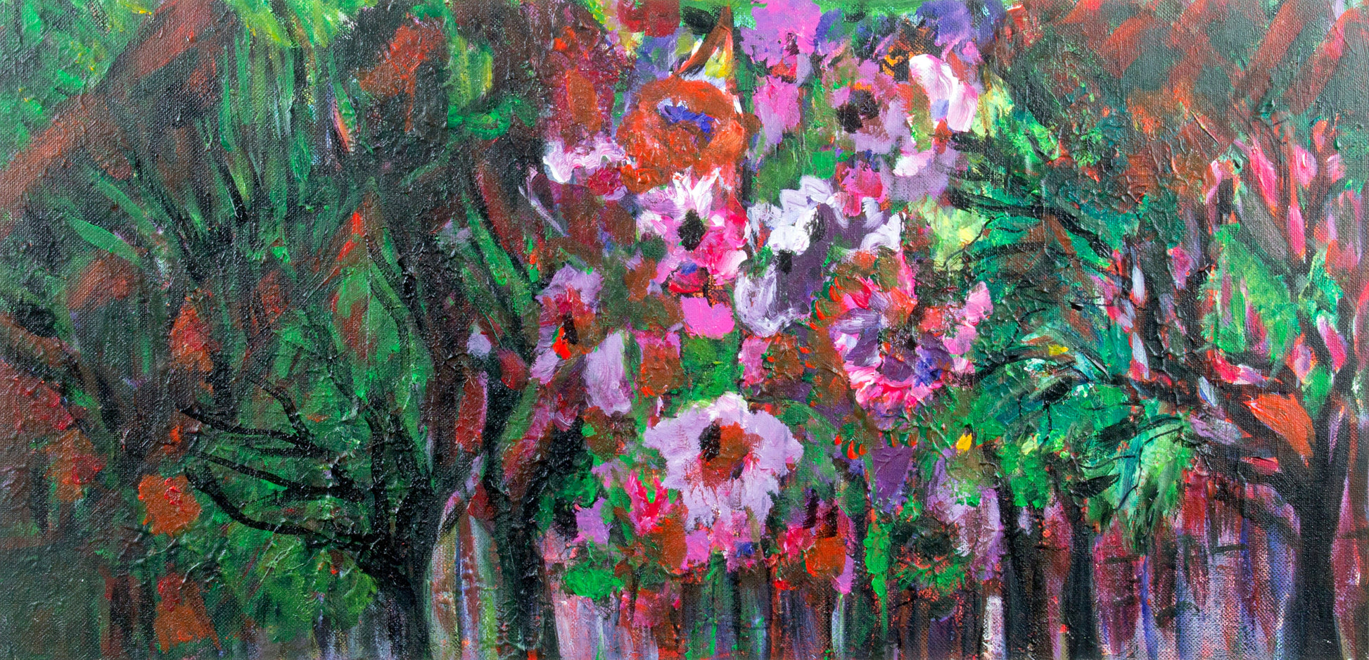 Joyous and unfiltered, this painting celebrates pink in all its vivid glory. A garden scene seen through rose-colored lenses—playful, soft, and full of heart.