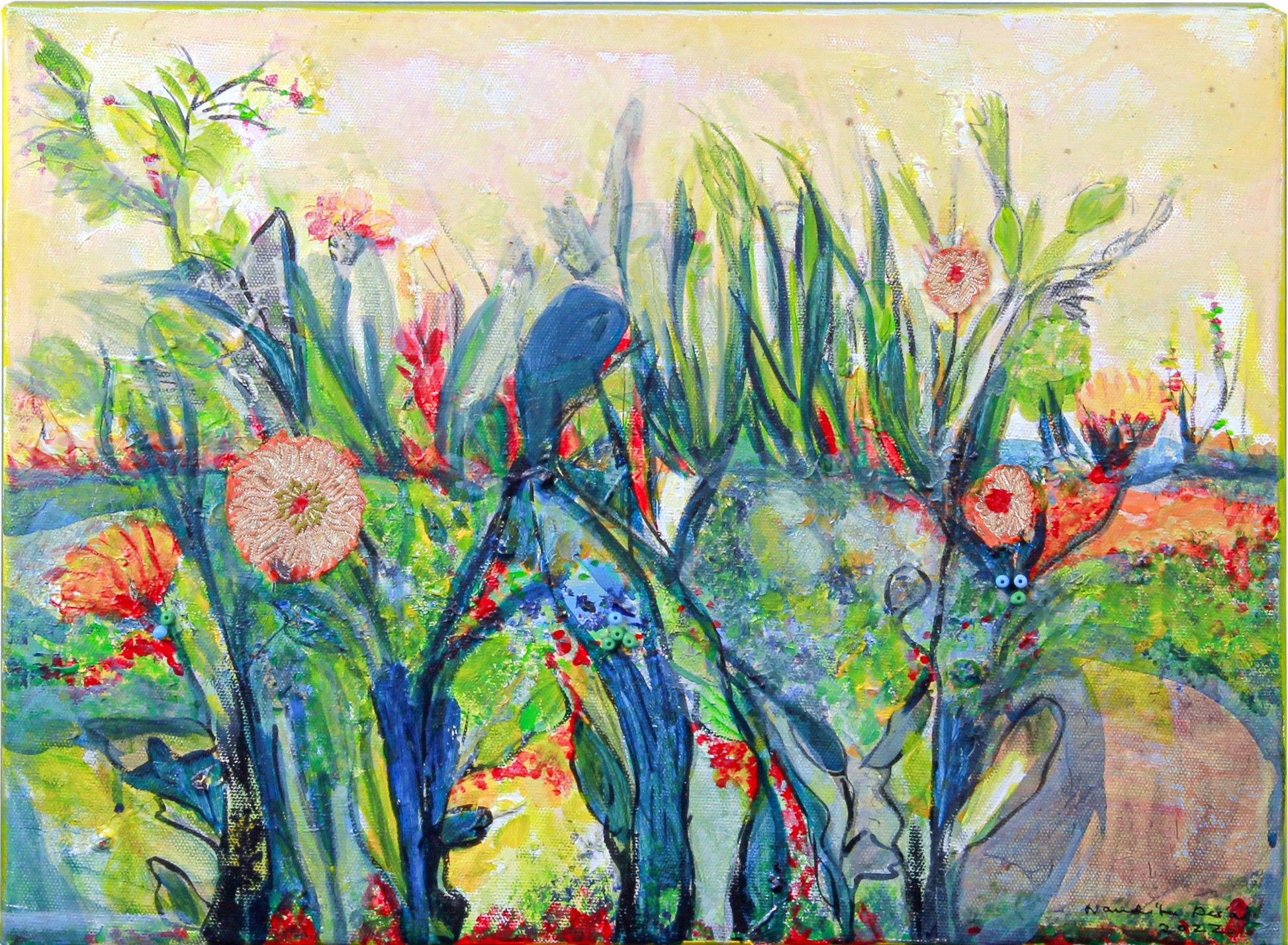 Dusky tones and shadowed florals blend into a stormy palette of greens and blues. A piece for the introspective—quiet, emotional, and full of painterly depth.