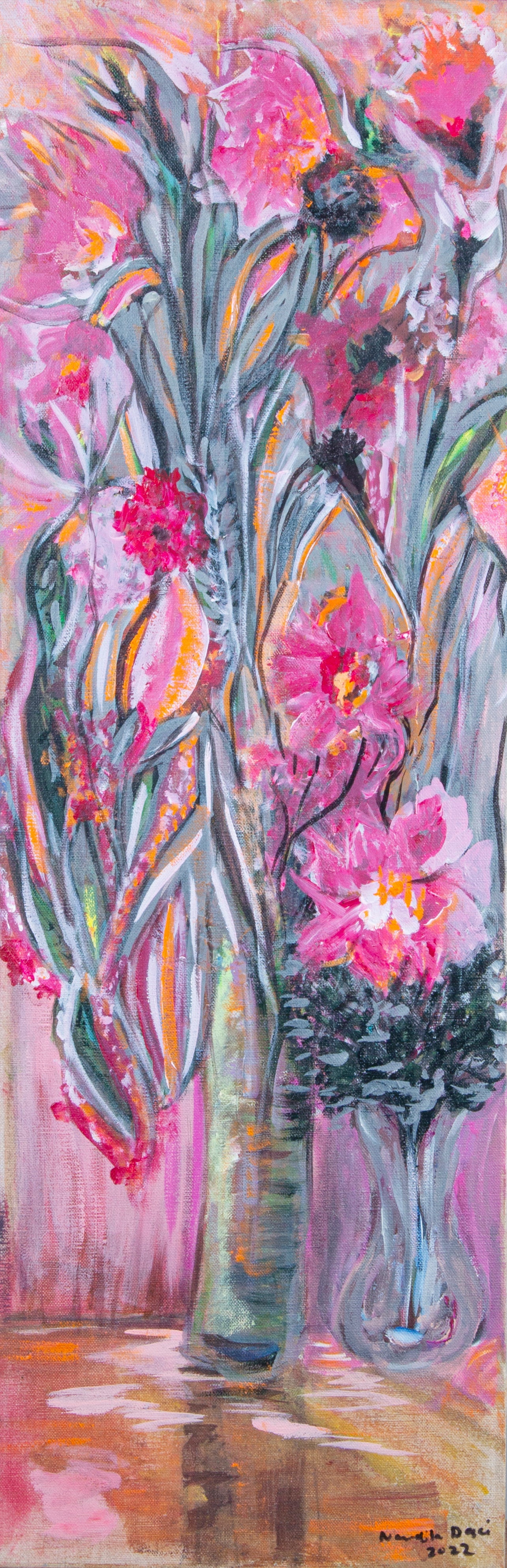 Whimsical and vertical in format, this piece suggests floral silhouettes drifting upward. Pale pinks and lavenders soften the canvas into a dreamy floral haze.